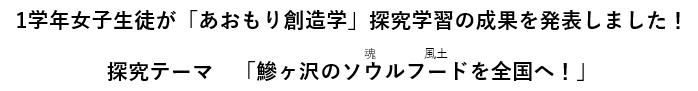 〇私はこれまで人前で自分の考えを発表したりすることはありませんでした。私は鰺ヶ沢町在住で町が賑やかになればよいという願いや思いはあっても課題を解決するために何ができるか等を真剣に考えたことがありませんでした。「あおもり創造学」の授業を通して、私が興味関心を持った「家畜の餌代の高騰について」情報収集をし知識を得たことで、いつの間にか課題解決に向けて具体的な対策を考えて地域に貢献したいと思っている自分がいました。課題解決は大人だけが考えるのではなくそこに住んでいる若者も含めた住民が、興味がある分野で働きがいがある鰺ヶ沢町・誇りに思える鰺ヶ沢町にするために何ができるかを考えることで、鰺ヶ沢町の未来をイメージすることができまし た。